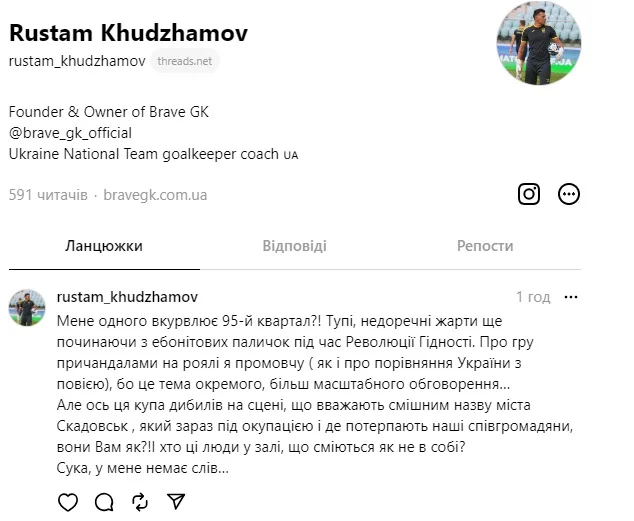 Але ось ця купа дебілів на сцені, що вважають смішним назву міста Скадовськ, який зараз під окупацією, і де потерпають наші співгромадяни, вони вам як?! І хто ці люди у залі, що сміються як не в собі? С**а, у мене немає слів…", – написав Худжамов у соцмережі Threads.
