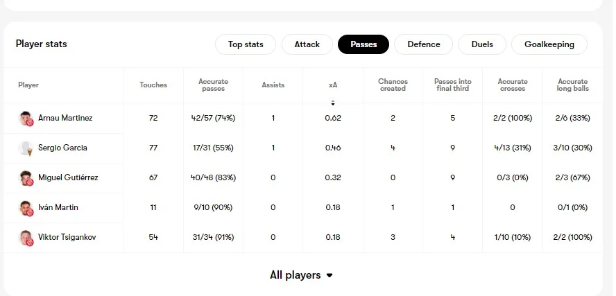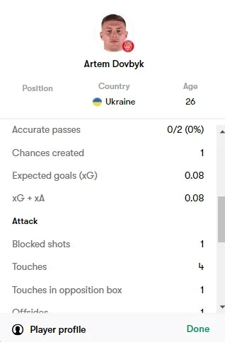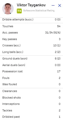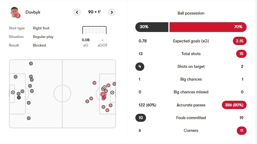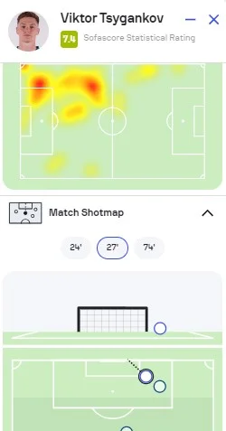 Курйозний факт: за 23 хвилини на полі Довбик (6,9 від FotMob, 6,8 – SofaScore) не віддав жодного точного пасу при 2 спробах і 4 контактах з м'ячем, 1 з яких трапився у штрафному. Однак при цьому оформив асист. Змарнував момент, оцінений у 0,08 xG. Також забрався в офсайд. Циганков завершив з кращими оцінками від згаданих статистичних порталів: 7,4 і 7,1. Віктор міг тричі забивати сам (на 0,09 xG) і створив стільки ж гольових нагод партнерам (0,18 xA). Відразу 9 разів прострілював у молоко, а знайшов адресата тільки в одному випадку. В іншій пасовій роботі показав солідний показник точності (91%).