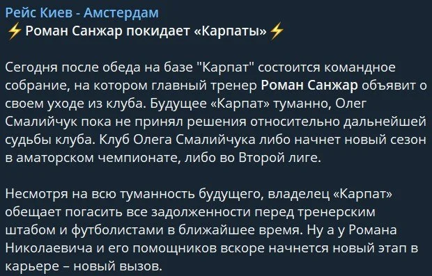 На сьогоднішніх командних зборах Карпат Роман Санжар оголосить про свій відхід з клубу та продовжить кар'єру в іншому місці. Разом із ним "зелено-білих" покинуть і його асистенти. Про це повідомив журналіст Олег Барков у Telegram.