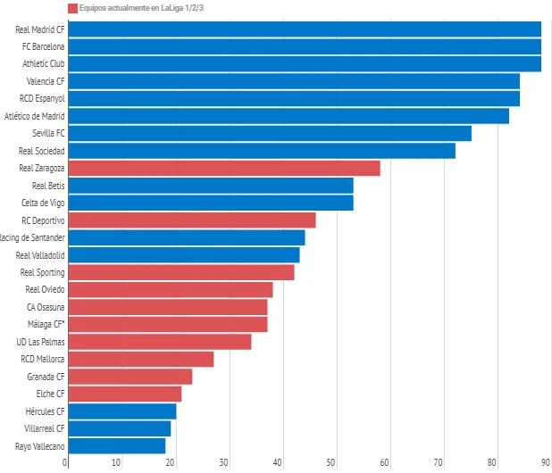 Інфографіка El Pais: команди, які провели найбільше сезонів у Прімері (червоним відзначені нинішні представники Сегунди).