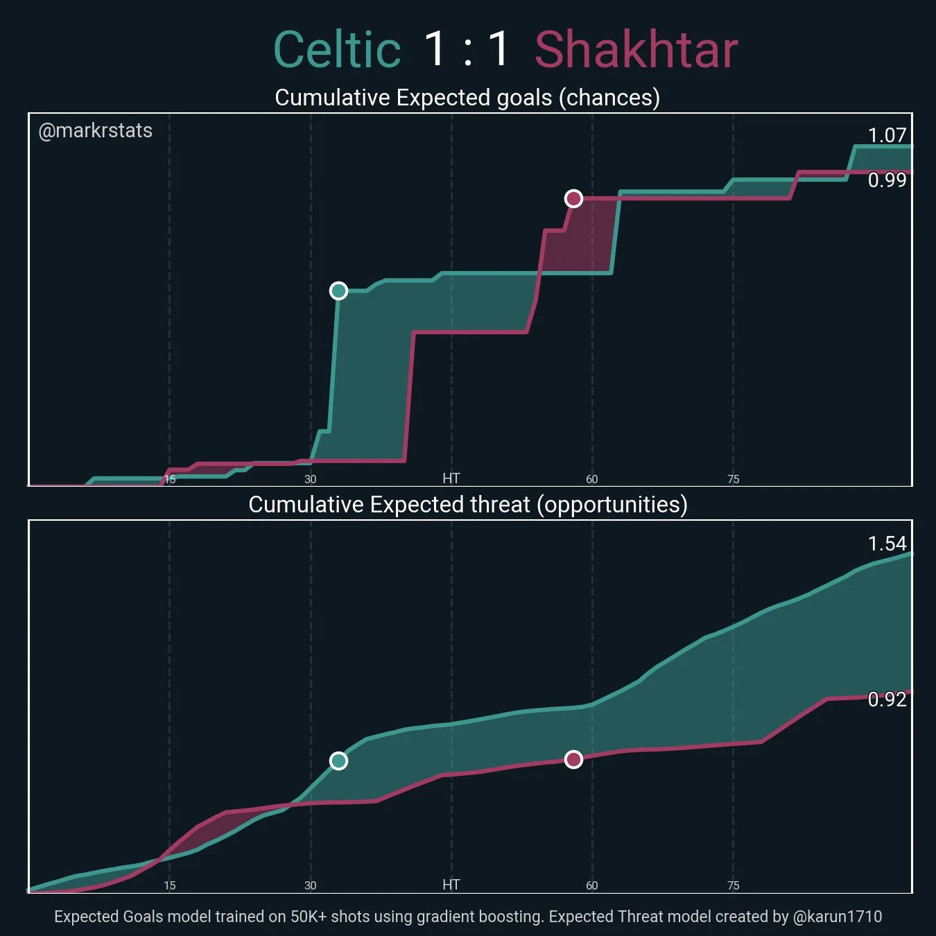 Попри всі емоції від виходу в євровесну, варто не забувати про об'єктивність. Промахи Сікана та Зубкова в другому таймі разом з диво-голом Мудрика затьмарили враження від ходу зустрічі у Глазго – багатьом здається, що Шахтарю не пощастило вирвати перемогу. Втім, за показником очікуваних голів донеччани відстають. Навіть по перерві xG обох колективів був лишень рівним.
