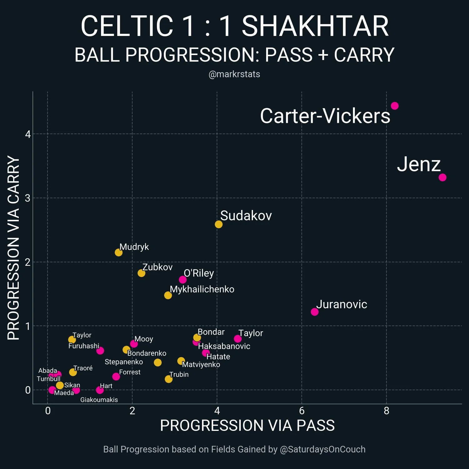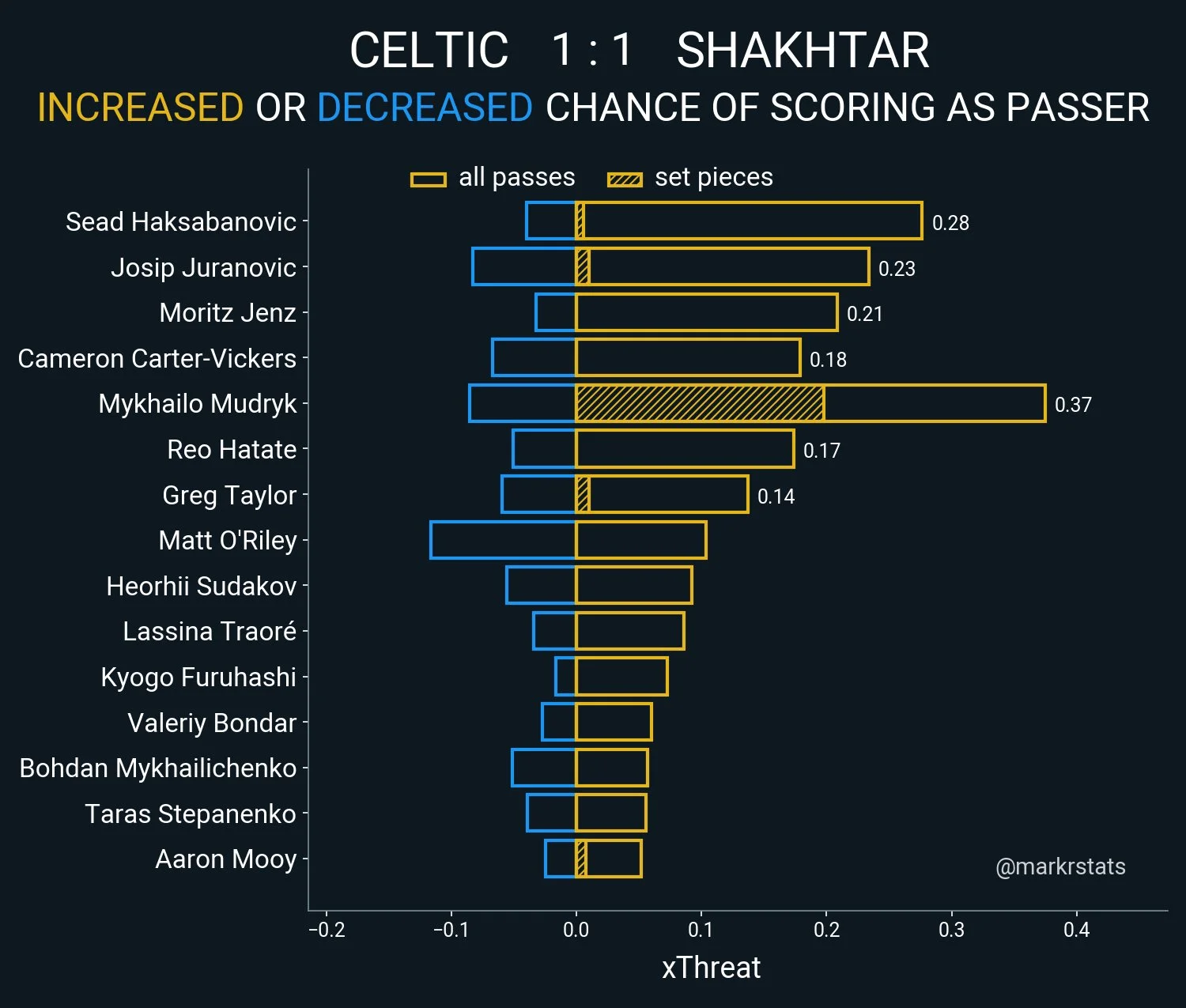 Такий футбол приніс Шахтарю 18 дотиків у штрафному, 4 постріли з його меж (без урахування стандартів), три явних гольових нагоди й диво-гол Мудрика. Це значно краще, ніж у першій зустрічі з Селтіком, коли було тільки 9 дотиків і 5 ударів загалом.