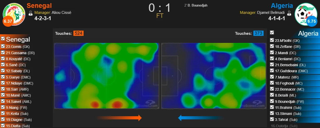 Практично за всіма статистичними показниками підопічні Аліу Сіссе переграли "лисів пустелі" з великою перевагою. 62% володіння м'ячем, 15:5 за успішними обіграшами, 142:69 за пасами в останню третину поля, 7:1 за передачами під удар, 72% точності пасів (проти 56% у Алжира), 75:56 за виграними єдиноборствами, 21:16 за верховими дуелями, 14:2 за відбираннями без контакту – все це ніяк не допомогло перемогти алжирський автобус. І це при такій тепловій карті!