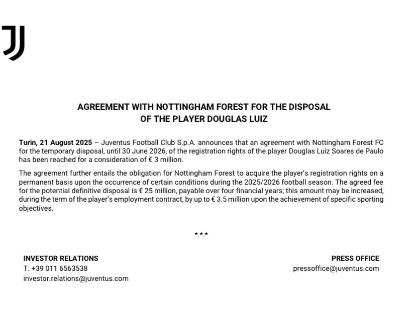 Ювентус повідомив, що отримає 3 мільйони євро за оренду Дугласа. Якщо опція викупу буде активована, то "лісники" виплатять 25 млн протягом чотирьох років. В угоді також прописані бонуси – до 3,5 млн. Варто зауважити, що спочатку туринці хотіли виручити за бразильця близько 50 мільйонів євро.