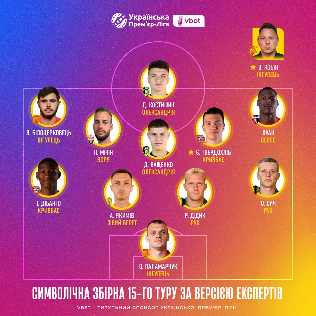 Українська Прем'єр-ліга визначила найкращих за підсумками 15-го туру.