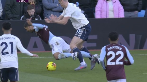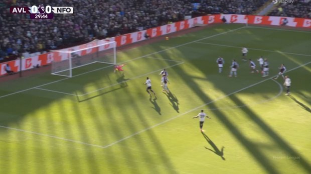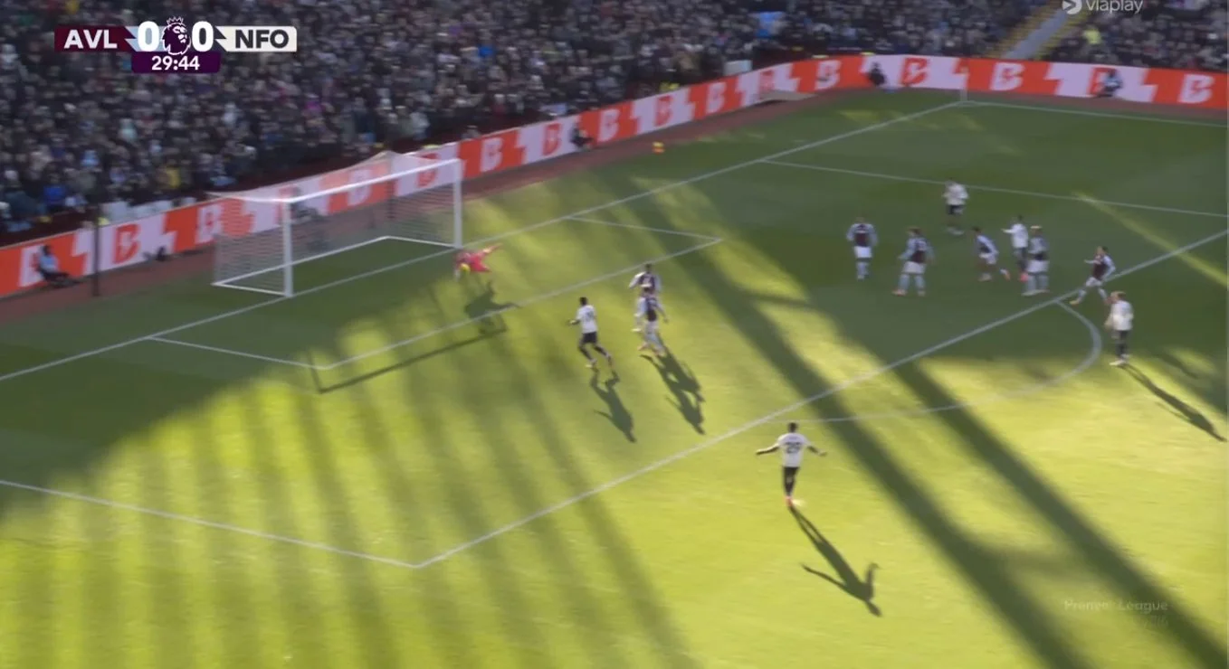 А ось і Ноттінгем відповідає пресингом. Ніколас Домінгес класно обікрав Бубакара Камара, прокинув повз Матті Кеша і віддав праворуч. Омарі Хатчінсон викручував у лівий кут – Еміліано Мартінес ефектно сейвить. Небезпечна подача кутового, аргентинський кіпер вміло вимушує фол в агресивній боротьбі з Міленковічем, хоча таке в поточному сезоні АПЛ частенько не свистять. На одному з повторів показали, як Мурільйо шипами притиснув коліно Роджерса до землі. На стоп-кадрі це виглядало жахливо, а Морган пошкутильгав трохи й побіг далі кошмарити суперника.