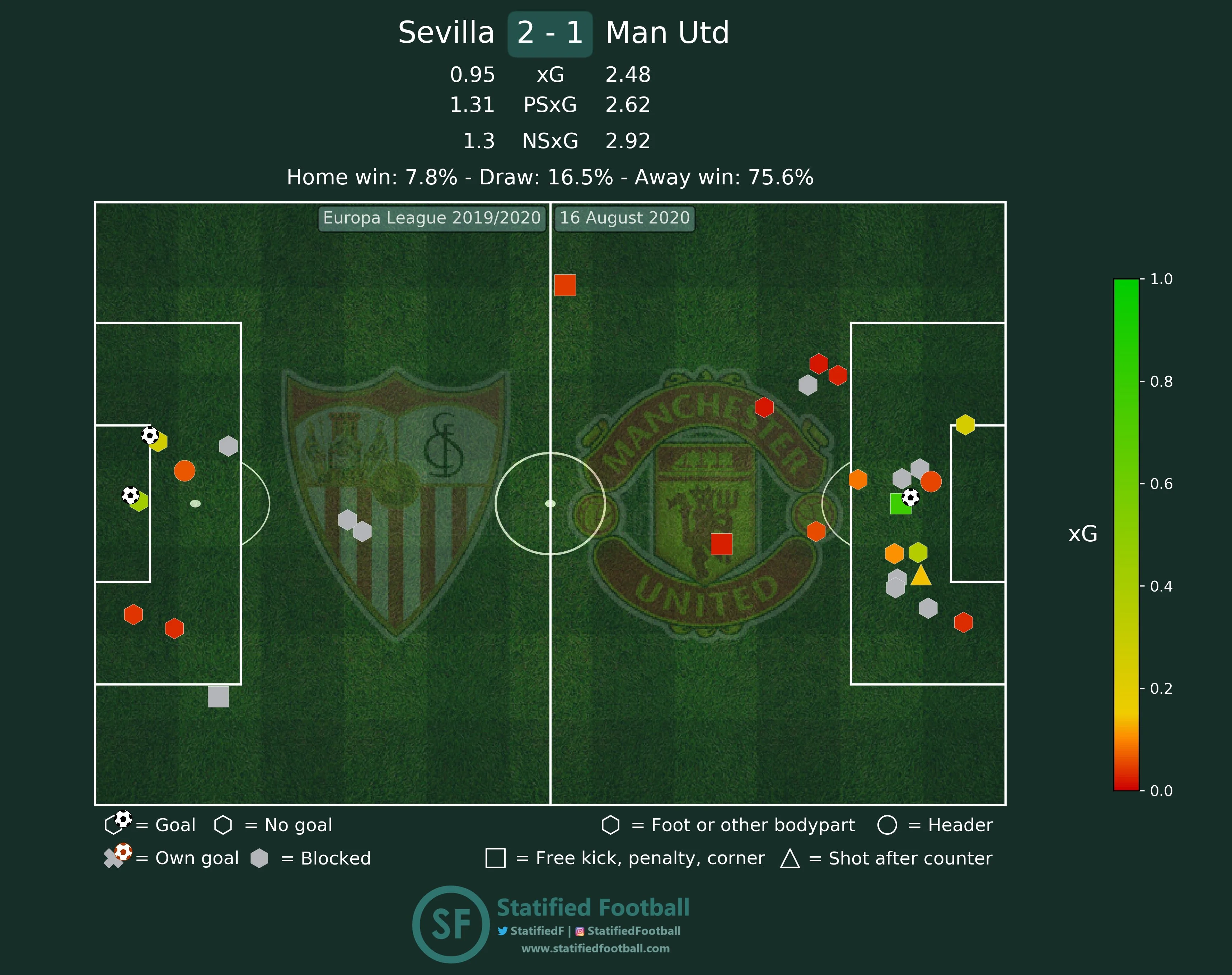 Все це, звісно ж, круто, однак рахунок у цьогорічному півфіналі був не по грі. Якщо переглянути хайлайти поєдинку, то там будуть лише два голи Севільї та, можливо, удар Окампоса з гострого кута, а весь інший час займуть класні моменти Манчестер Юнайтед – самих лише виходів віч-на-віч у "дияволів" було три. Загалом, на 9 ударів андалусійців у матчі припало аж 20 пострілів манкуніанців, з яких 13 пройшло з меж штрафного (3:7 за влучаннями в площину). За очікуваними голами (xG) підопічні Оле-Гуннара Сульшера виграли з рахунком 0,95 - 2,48, а за очікуваними голами після ударів (PSxG) перевага подвійна.