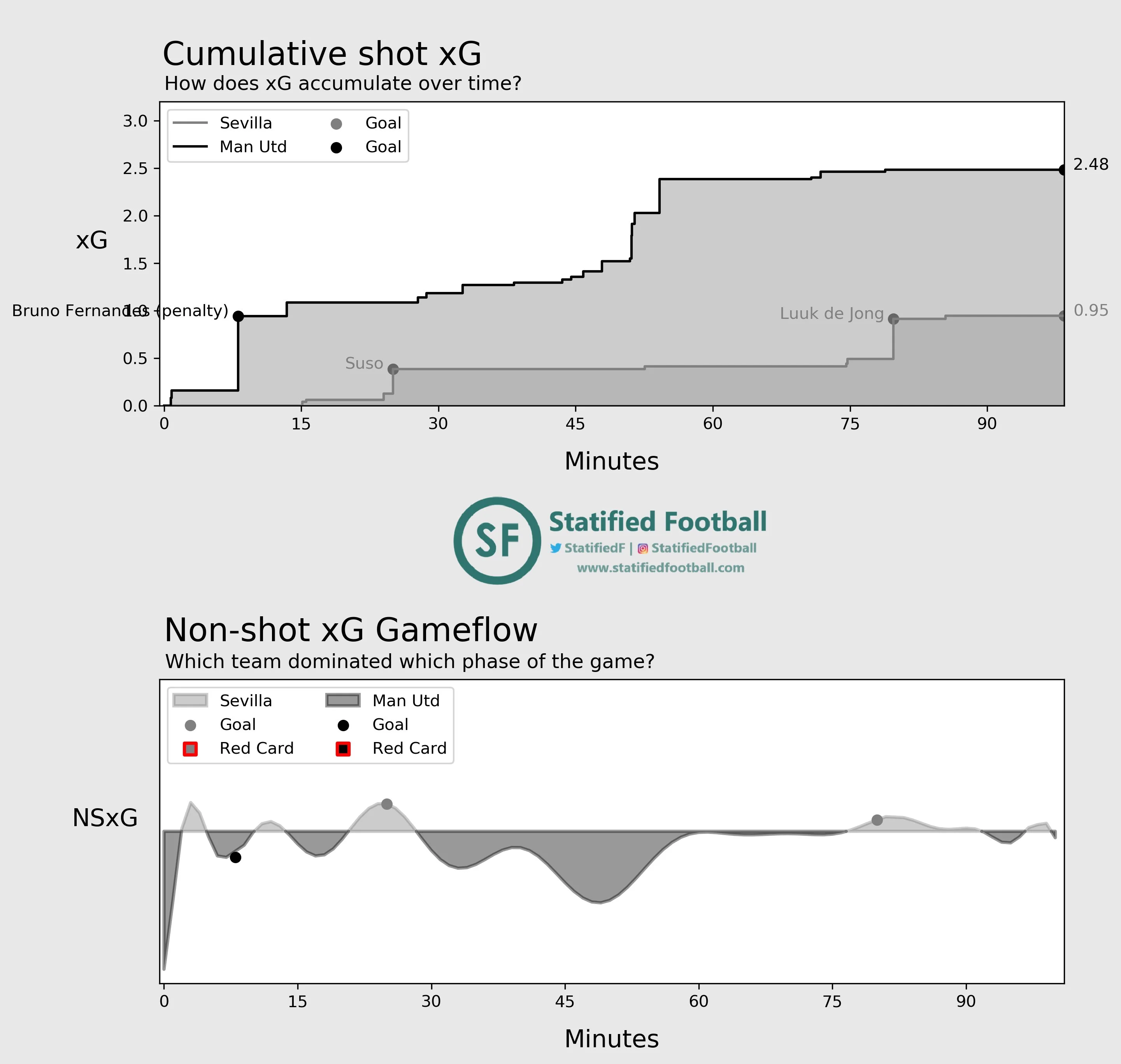 Перевагу Манчестер Юнайтед над Севільєю демонструє і графік non-shot xG, в якому вираховується можливість голу після будь-яких дій, крім удару. Зокрема, тут важливе значення отримують перехоплення біля штрафного та проходи на дриблінгу, ну і передачі з відбираннями та підбираннями. На графіку можна помітити, що МЮ домінував більшу частину зустрічі.
