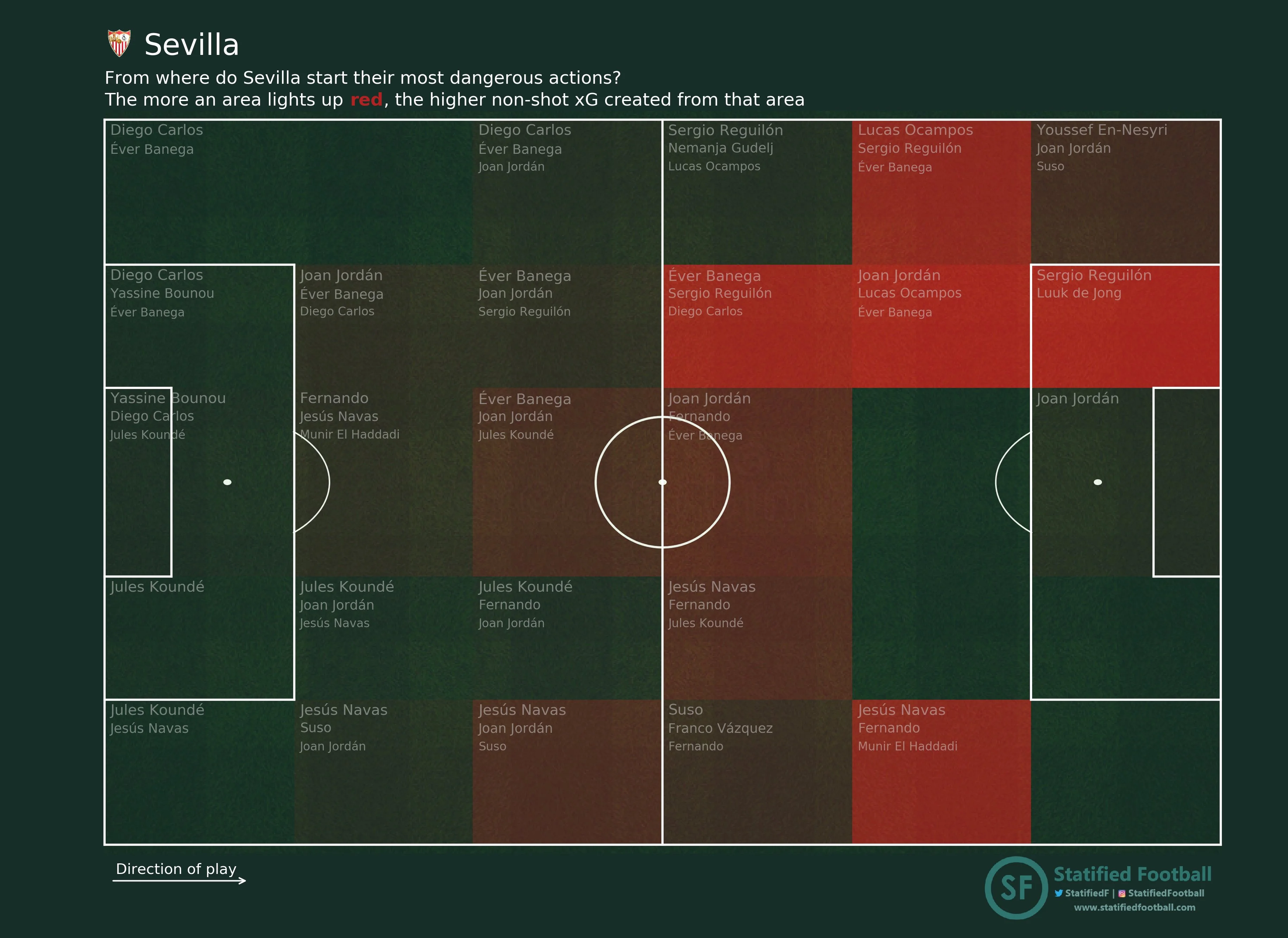 Ще більш переконливо виглядає статистика обіграшів на дриблінгу – 9 спроб, 7 вдалих (50% вдалих обіграшів Севільї). Також у Евера 7 підбирань. Яскравою є і карта початку найбільш небезпечних дій – Банега помітний у всіх центральних квадратах та на лівому фланзі.