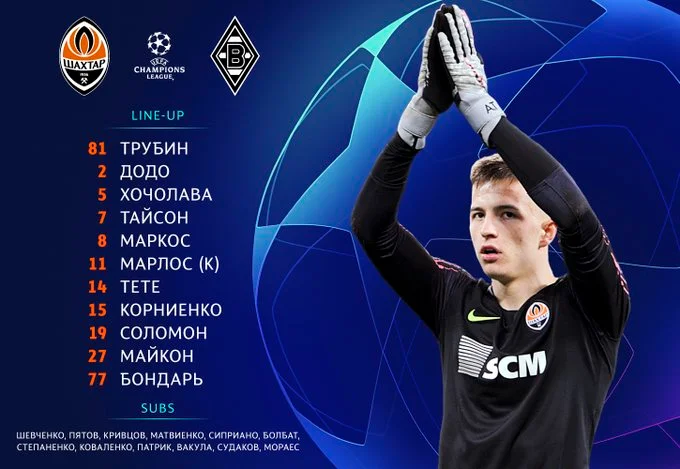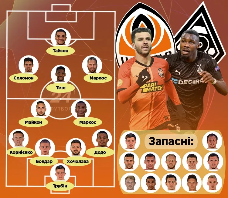 Шахтар: Трубін – Додо, Бондар, Хочолава, Корнієнко – Майкон – Тете, Марлос, Антоніо, Соломон – Тайсон