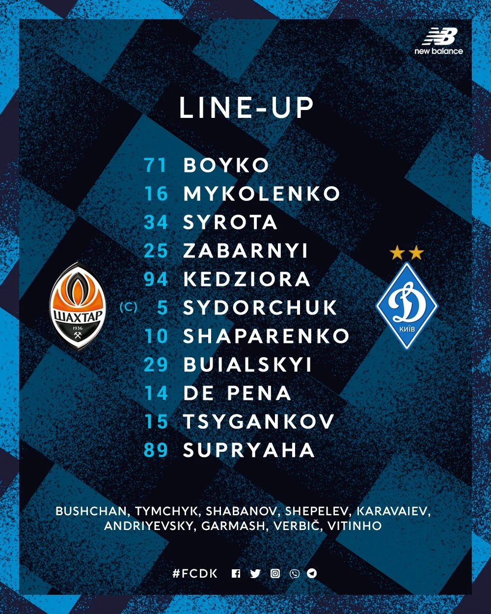 Динамо: Бойко – Кендзьора, Сирота, Забарний, Миколенко – Сидорчук (к), Шапаренко – Циганков, Буяльський, Де Пена – Супряга