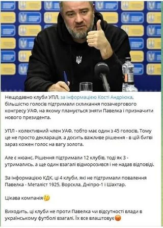 Нещодавно журналіст Констянтин Андріюк повідомляв, що більшість клубів УПЛ підтримали скликання позачергового конгресу УАФ, де планували зняти з посади президента УАФ Андрія Павелка.
