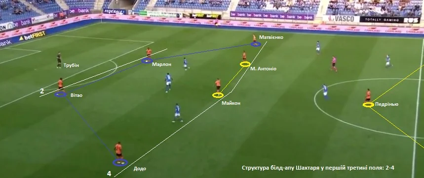 Додо і Матвієнко залишалися на своїй третині поля, формуючи з опорниками лінію з чотирьох гравців. Цей метод дозволяв мати у зоні взаємодій чисельну більшість, що, звісно, сприяло ефективним умовам для просунення м'яча у другу третину поля. Шахтар не поспішав у цій стадії атаки. Гості виманювали суперника зі своїх позицій і потім шукали вектори для того, щоб обрізати велику кількість футболістів Генка.