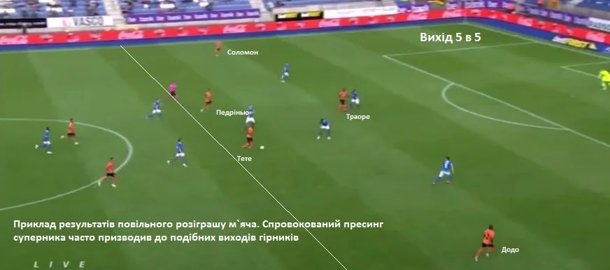 Таким чином гості змушували суперника грати через фланг. Коли виконувалася передача на фулбека, ця геометрична структура швидко зникала. Гравці Шахтаря починали пресингувати один в один. Вільним залишався лише фулбек на протилежному фланзі та воротар.
