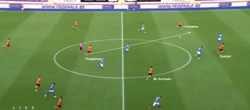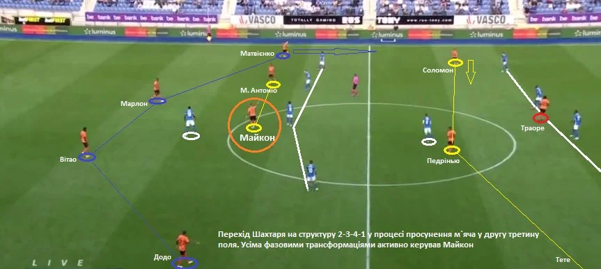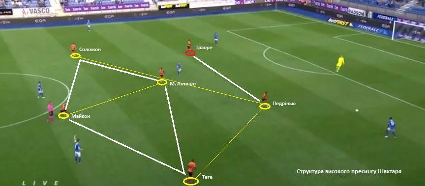 Ще потрібно звернути увагу на структуру високого пресингу "гірників". Шахтар у деструктивній фазі часто перебудовувався на 4-4-2 (ромб). На фото добре видно, як це відбувалося. Майкон залишався позаду, а Маркос Антоніо займав позицію на вершині ромбу. Педрінью тиснув на захисників разом з Траоре.