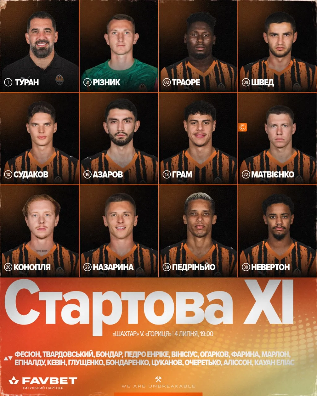 Стартовий склад Шахтаря: Різник – Конопля, Грам, Матвієнко (к), Азаров – Назарина, Судаков – Швед, Педрінью, Невертон – Траоре.