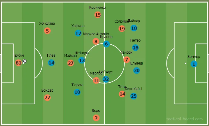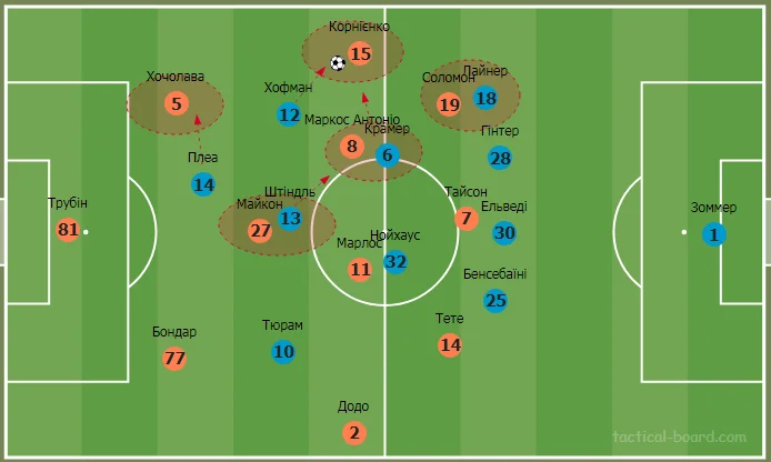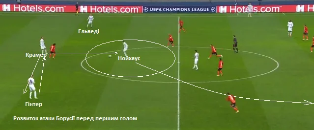 У фазі гри з м'ячем фулбеки Борусії підіймалися досить високо і підтримували ширину. Пара центральних захисників розходилася по боках, звільнюючи простір для зміщення одного з центральних хавбеків. Переважно це був досвідчений Крамер, але інколи замість нього у лінію оборони сідав Нойхаус. До речі, обидва опорники Борусії у другому таймі почергово, ефективно і своєчасно атакували простір у штрафному Шахтаря.