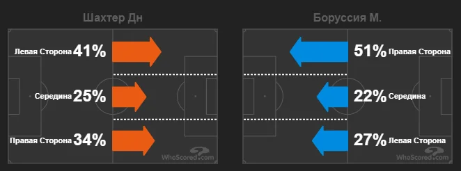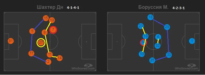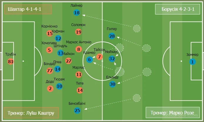 Фулбеки Шахтаря відразу потрапляли під пресинг. Гравці німецького клубу організовано звужували простір між собою та суперником, який володів м'ячем, по векторах зон його найближчих партнерів.