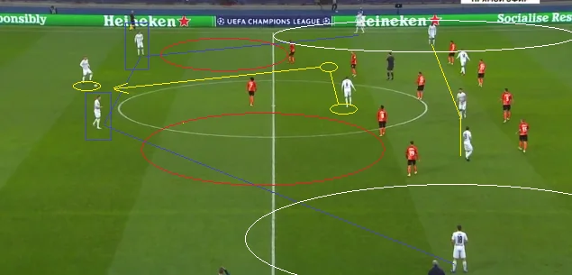 Трійка на початку позиційної атаки Гладбаха – це один із головних принципів штабу Марко Розе. Навіть незважаючи на відсутність пресингу від Шахтаря, це важливо для утворення кількості векторів для передач у другу третину поля. Дуже важливо, щоб ці вектори були переважно діагональними. Часто у даній стадії атаки за просування м'яча відповідають зміщені у найближчі для себе півфланги центральні захисники.