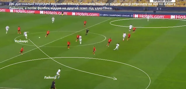 Той, своєю чергою, діагональним прострілом на другий темп віддав м'яч на найкращого у цьому матчі гравця (Плеа), який забий свій перший з трьох голів. Це чудовий приклад того, як просто Гладбах справлявся з компактним блоком Шахтаря.