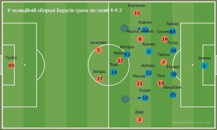 Борусія дотримувалася проактивних методів оборони, але інколи брала паузу і сідала у позиційну оборону. Хофман і Тюрам зміщувалися до хавбеків і команда переходила на формацію 4-4-2 (4-4-1-1). Штіндль залишався з Плеа попереду.
