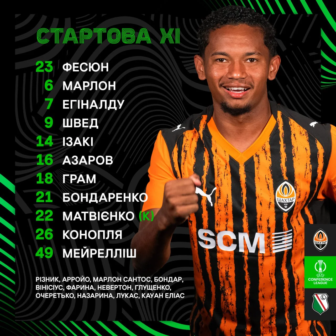 Запасні: Різник, Арройо, Марлон Сантос, Бондар, Вінісіус, Фарина, Невертон, Глущенко, Очеретько, Назарина, Лукас, Кауан Еліас.