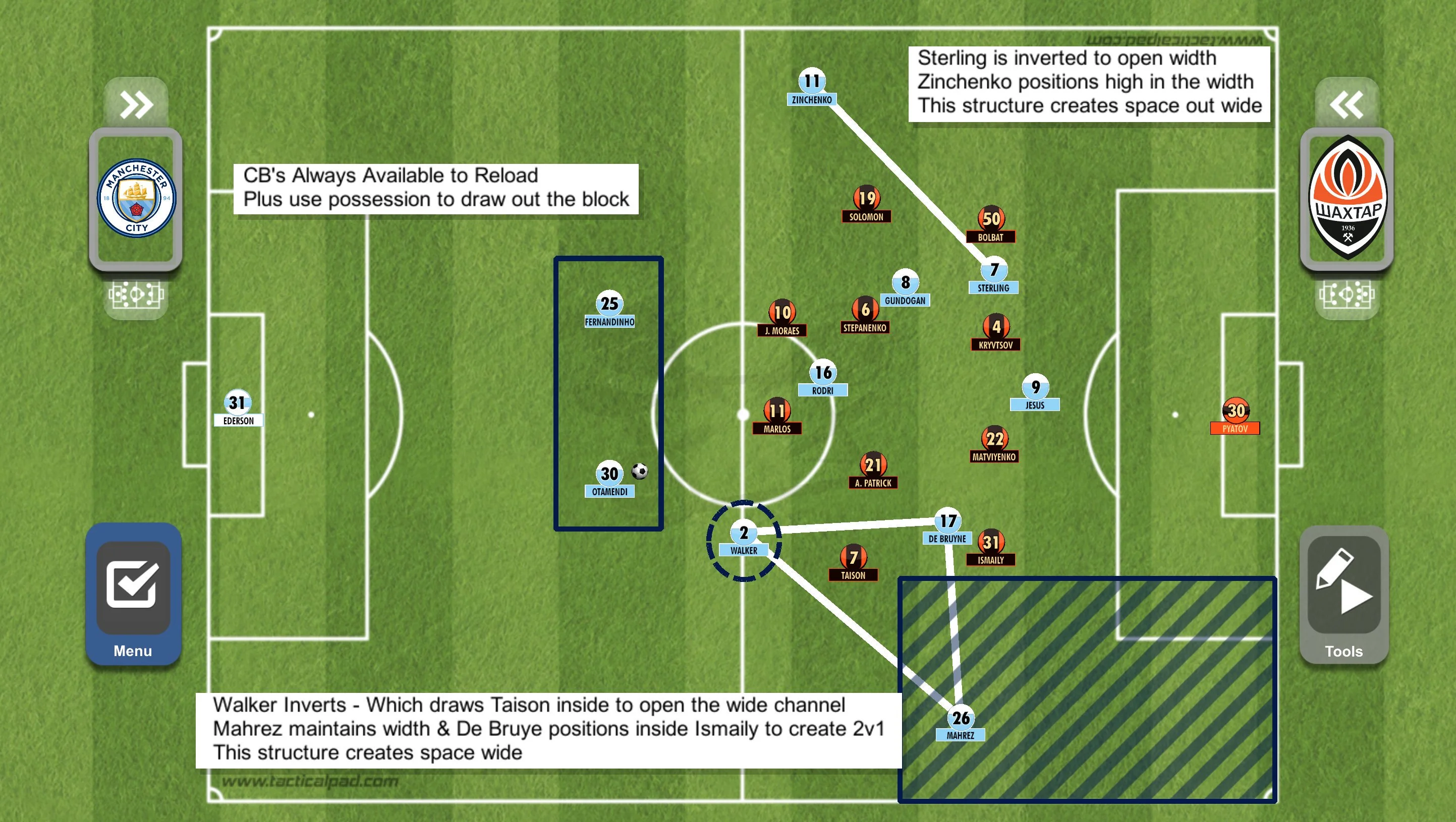 Створення ситуацій 2 в 1 у півфлангах (зліва Стерлінг, справа де Брюйне, грамотний рух Жезуса), які ставили мат захисникам Шахтаря. Ті просто губилися, а в кращому випадку опинялися сам на сам і все одно програвали боротьбу.
