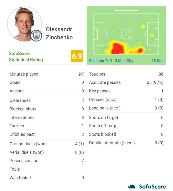 Інший екс-"гірник" Олександр Зінченко відіграв зліва в обороні свій стандартний матч. Багато передач (4-й результат у команді), хороша підтримка атак з забезпеченням ширини на фланзі та використанням простору, який звільняв Стерлінг. Позаду Шахтар не ставив перед ним важких завдань, але свої 3 перехоплення (найбільше в Сіті) та 2 виноси він набрав.