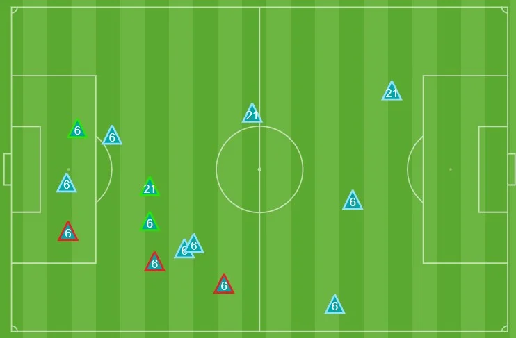 Ще один спосіб розтягнути блок "гірників" втілювали центрбеки. Виманювання пасивним контролем м'яча на себе перші дві лінії пресингу українців, коли форварди залишаються у високих позиціях і тримають поруч лінію оборони. Так виникали розриви у центрі поля.