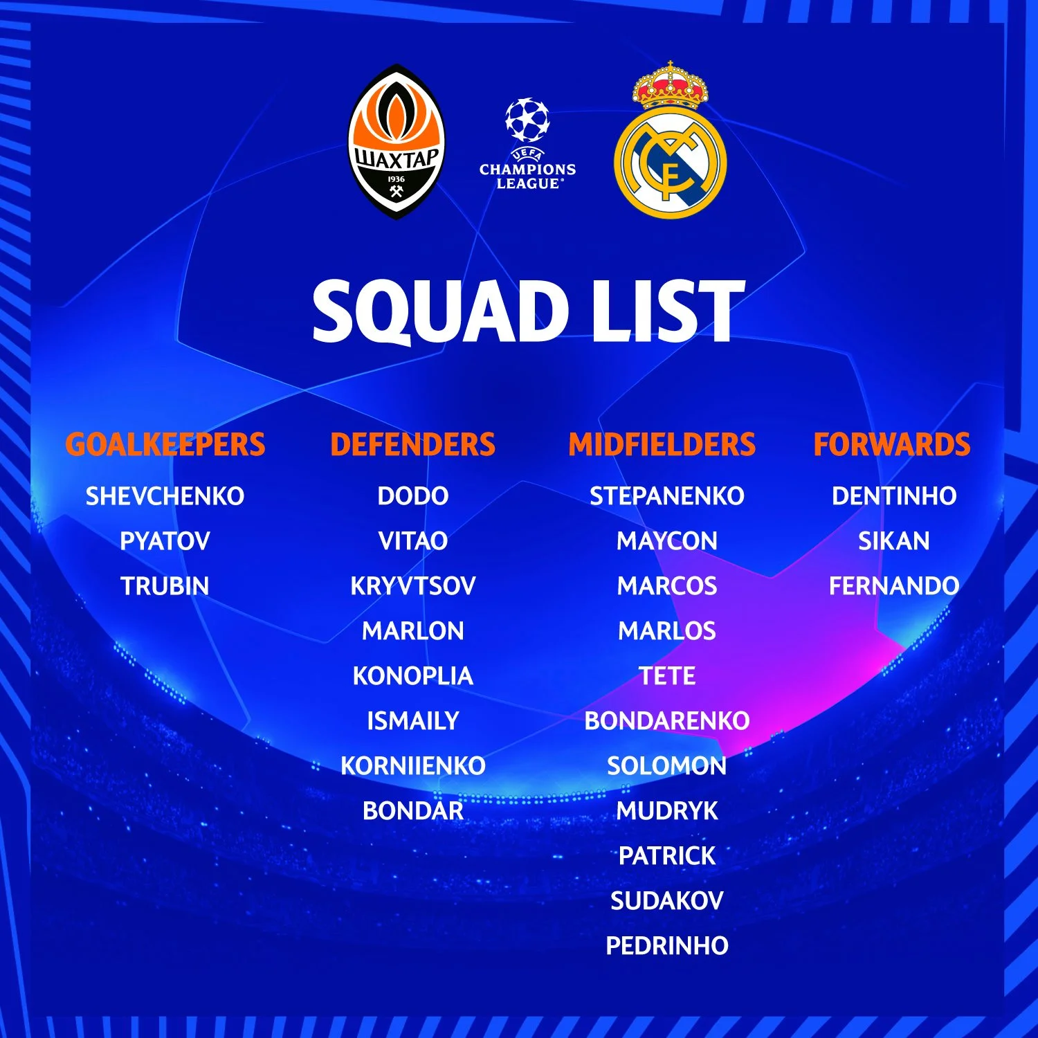 Нагадаємо, поєдинок з Реалом відбудеться вже сьогодні, 19 жовтня, на НСК Олімпійський. Початок зустрічі о 22:00.
