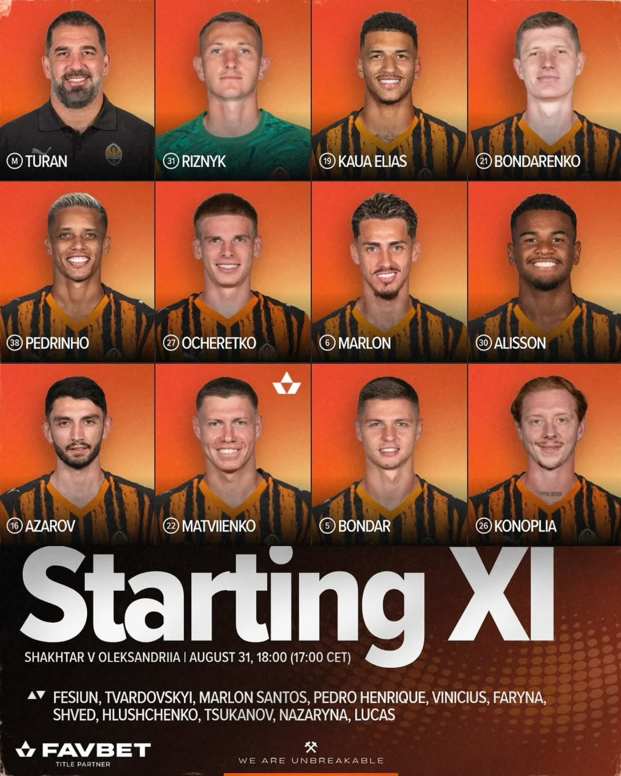 Шахтар: Різник, Конопля, Бондар, Матвієнко, Азаров, Гомес, Аліссон, Бондаренко, Очеретько, Педрінью, Еліас.