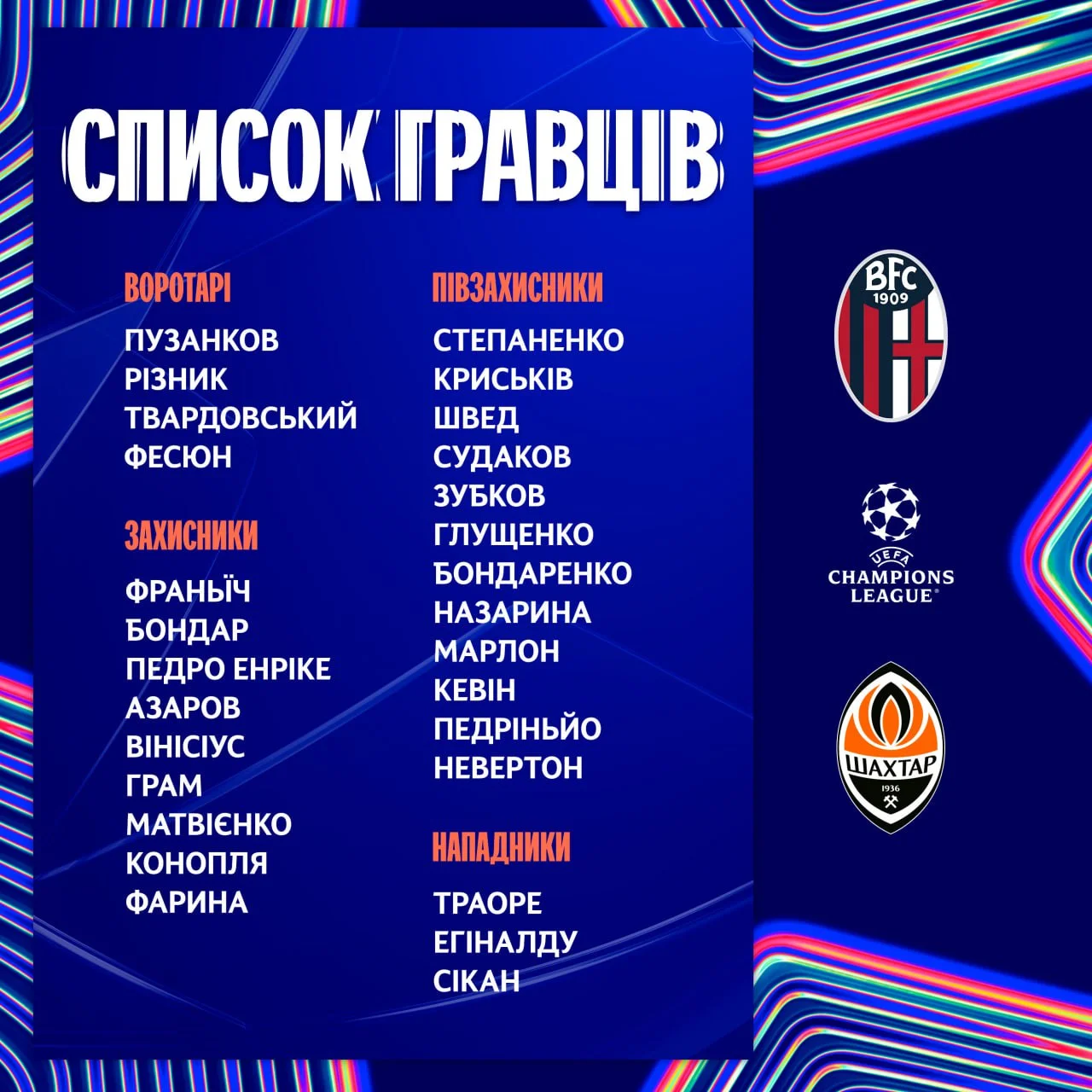 Головний тренер Шахтаря Маріно Пушіч визначився зі списком гравців, які вирушать на поєдинок 1-го туру групового етапу Ліги чемпіонів проти Болоньї.