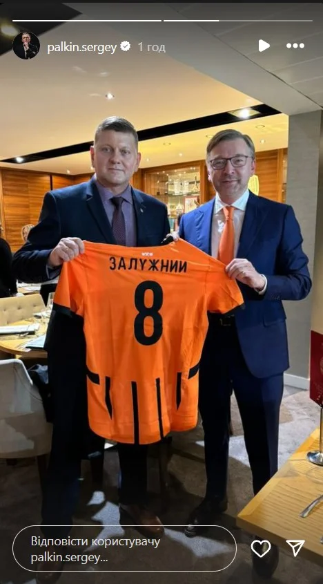 Сергій Палкін у своєму Instagram поділився світлиною, на якій вручає іменну футболку Шахтаря колишньому головнокомандувачу Збройних сил України, а нині надзвичайному і повноважному послу України у Великобританії, Валерію Залужному.