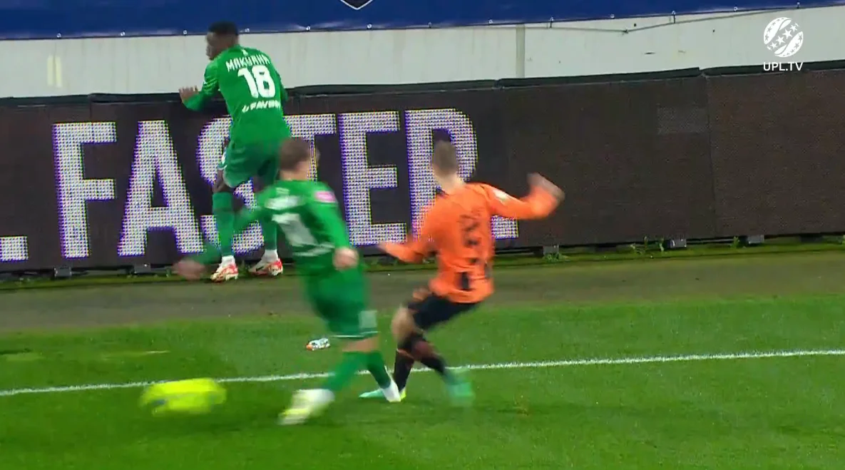 Наприкінці тайму пошкодження отримав Бені Макуана. "Конголезький Мбаппе" кілька хвилин пролежав на газоні за боковою лінією, але заміни Юрій Калітвінцев вирішив не робити, шоб не витрачати зайвий слот до перерви. 0:0 за голами, 1:1 за травмами – підсумок першого тайму. Який міг завершитися призначенням пенальті на користь Шахтаря. Тейлор відверто сфолив проти Невертона у штрафному. Захисника Полісся врятував свисток арбітра про офсайд.