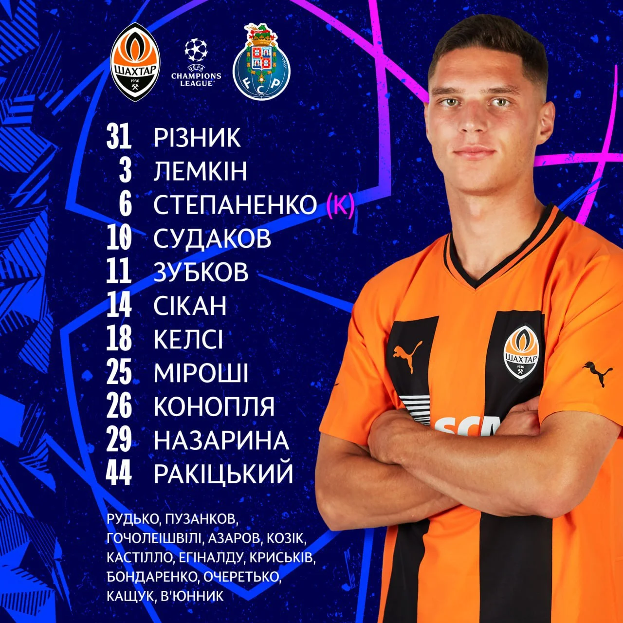 Запасні: Рудько, Пузанков, Гочолеішвілі, Азаров, Козік, Кастільо, Егіналду, Криськів, Бондаренко, Очеретько, Кащук, В’юнник