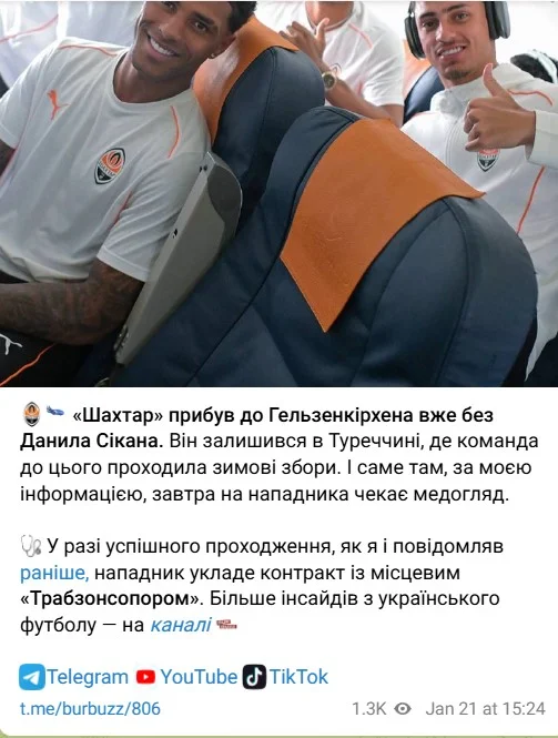 "Шахтар прибув до Гельзенкірхена вже без Данила Сікана. Він залишився в Туреччині, де команда до цього проходила зимові збори. І саме там, за моєю інформацією, завтра на нападника чекає медогляд.