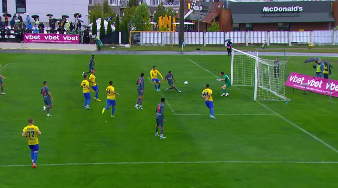 На 22-й же Вінісіус зачепився за відскок після кросу з правого флангу, потужно вистріливши з лету. Пазенко парирував його удар у ближній кут, а потім ще й взяв добивання. Здавалося, що футболісти відправляться відпочивати за нулів на табло, але у компенсований час Шахтар таки відкрив рахунок.