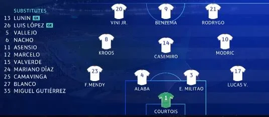 Реал: Куртуа, Васкес, Мілітао (Вальєхо, 87), Алаба, Менді (Марсело, 69), Модріч (Камавінга, 78), Каземіро, Кроос (Вальверде, 78), Родріго (Асенсіо, 78), Бензема, Вінісіус