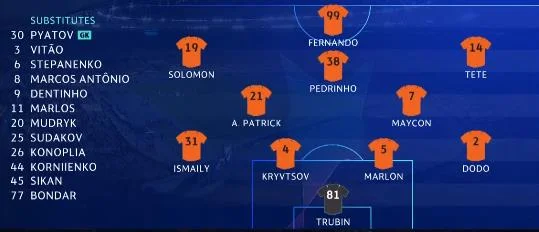 Шахтар: Трубін, Додо, Марлон, Кривцов (К), Ісмаїлі (Корнієнко, 74), Майкон, Алан Патрік (Степаненко, 79), Тете (Марлос, 46), Педрінью, Соломон (Маркос Антоніо, 46), Фернандо (Мудрик, 74)