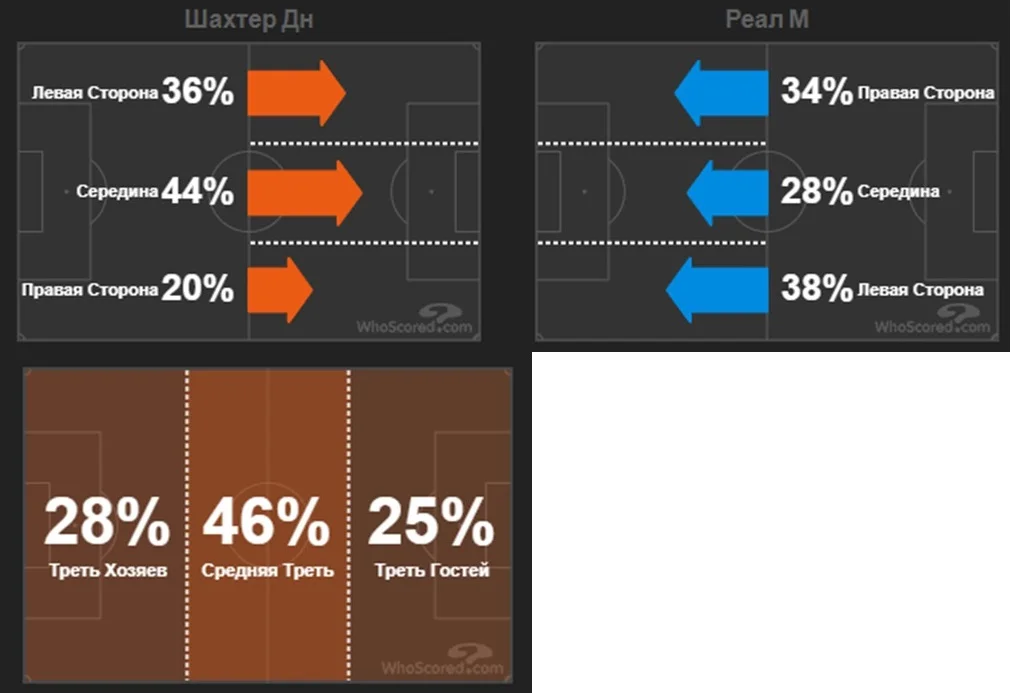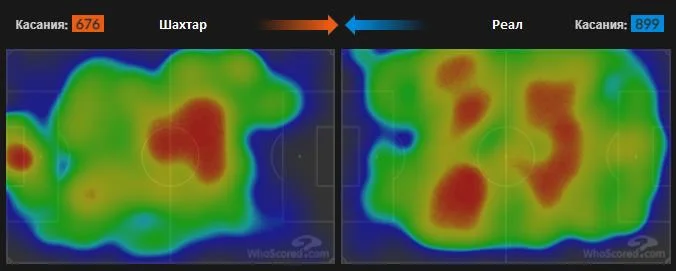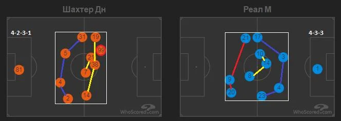 Пресинг Шахтаря також був малоефективним. Реал дуже легко виходив з-під нього та швидко просував м`яч у фінальну третину, де, як правило, все закінчувалося кросами чи ударами з-за меж штрафного. У позиційній обороні господарі перебудовувалися на структуру 4-4-2 з пасивними Педрінью та Фернандо у передній лінії оборони.
