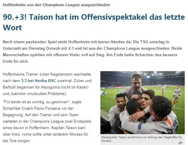 "Після захопливого матчу Хоффенхайм залишився з порожніми руками. Клуб програв у меншості Шахтарю з рахунком 2:3 і вилетів з Ліги чемпіонів. Обидві команди грали у повністю відкритий футбол на перемогу. У підсумку Шахтар краще завершив матч", – інформує провідне німецьке спортивне видання.