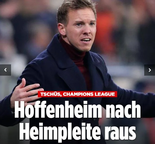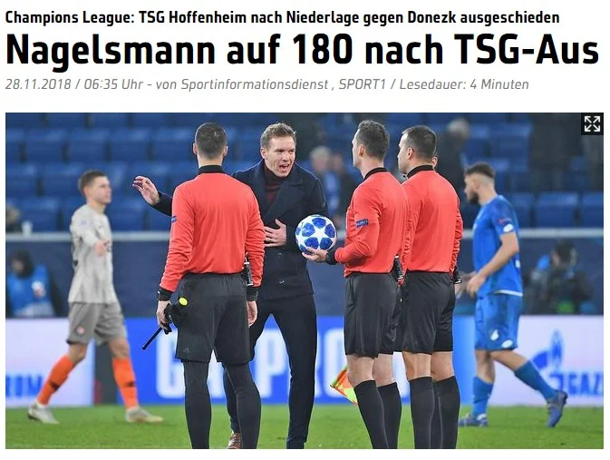 Портал будує розповідь про матч навколо головного тренера господарів і його гострих фраз. Нагельсманн був роздратований і незадоволений усім. Він жорстко розкритикував арбітра за червону картку Шалаю. Потім реалізацію своєї команди: "Скористатися шансами, які ви створюєте, це також якість футболіста". Втім, не звинувачував підопічних у вильоті: "Хлопці віддали все, але цього виявилося недостатньо. Неймовірно шкода".