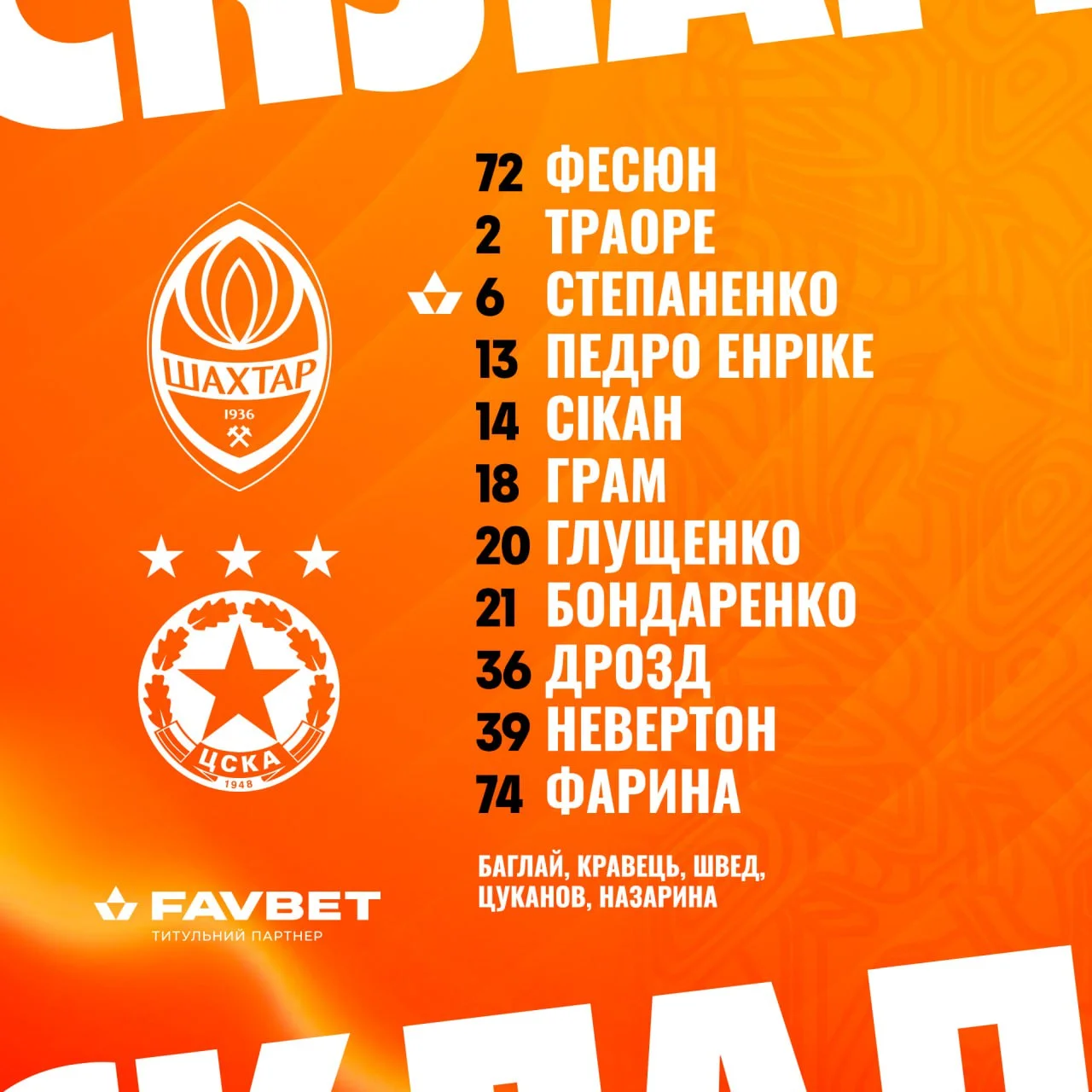 Стартовий склад Шахтаря: Фесюн, Траоре, Степаненко, Педро Енріке, Сікан, Грам, Глущенко, Бондаренко, Дрозд, Невертон, Фарина.