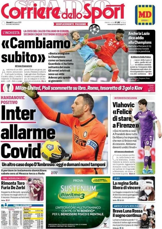 Не до Ліги Європи і Corriere dello Sport. Тут більше уваги приділили поразці Лаціо: "Врятована принаймні гідність". Видання пропонує своє "розслідування провалу в ЛЧ". На думку журналістів та експертів, недостатньо самої лише гонитви за призовими. Потрібно більше довіряти молодим футболістам.