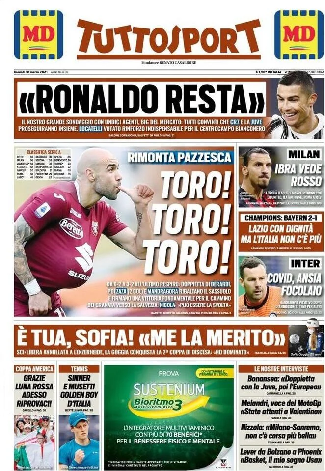 Не зраджує собі TuttoSport. Для туринського видання несуттєве все, що відбувається за межами П'ємонту. Матч аутсайдера Серії А? Хороший варіант для центрального місця на передовиці! Якщо без сарказму, то "бики" справді заслуговують на увагу, оскільки здійснили маленьке диво, відігравшись після 0:2. Однак можна це висвітлити з меншим розмахом.