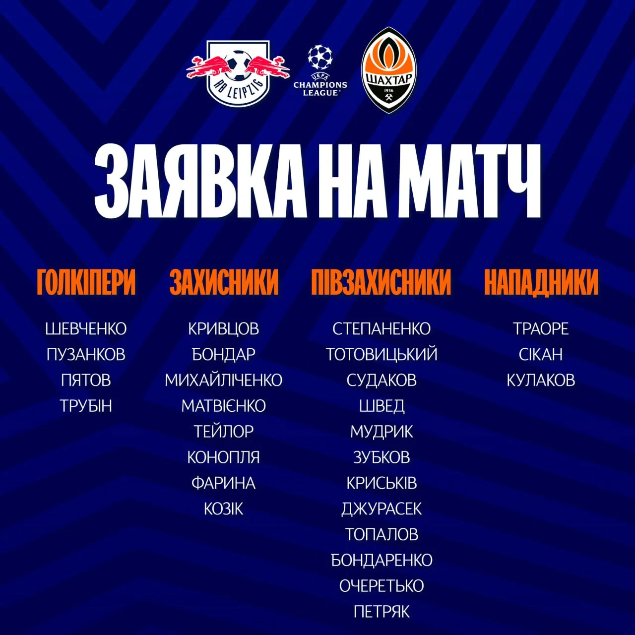 Список гравців Шахтаря на матч проти РБ Лейпциг: