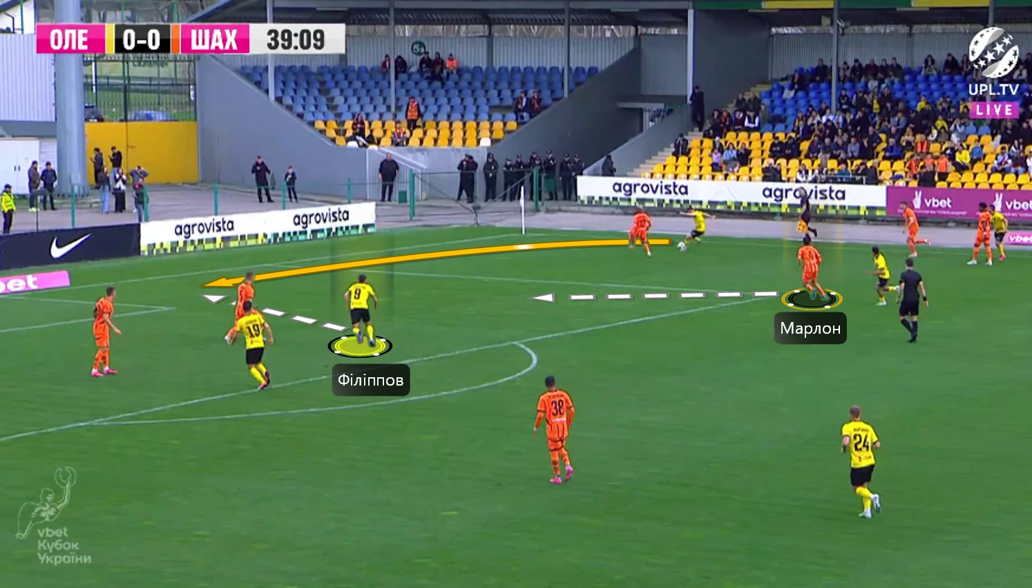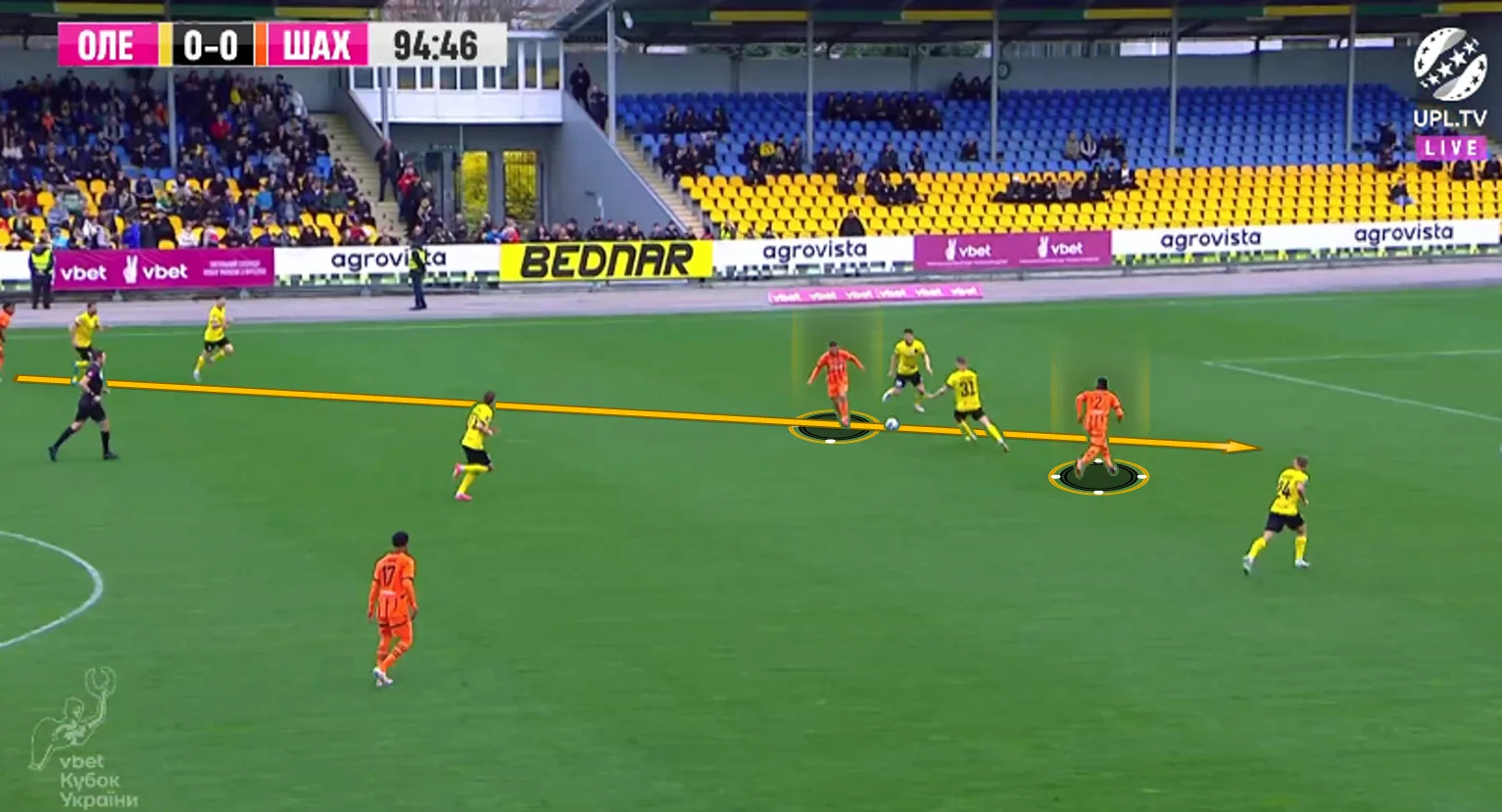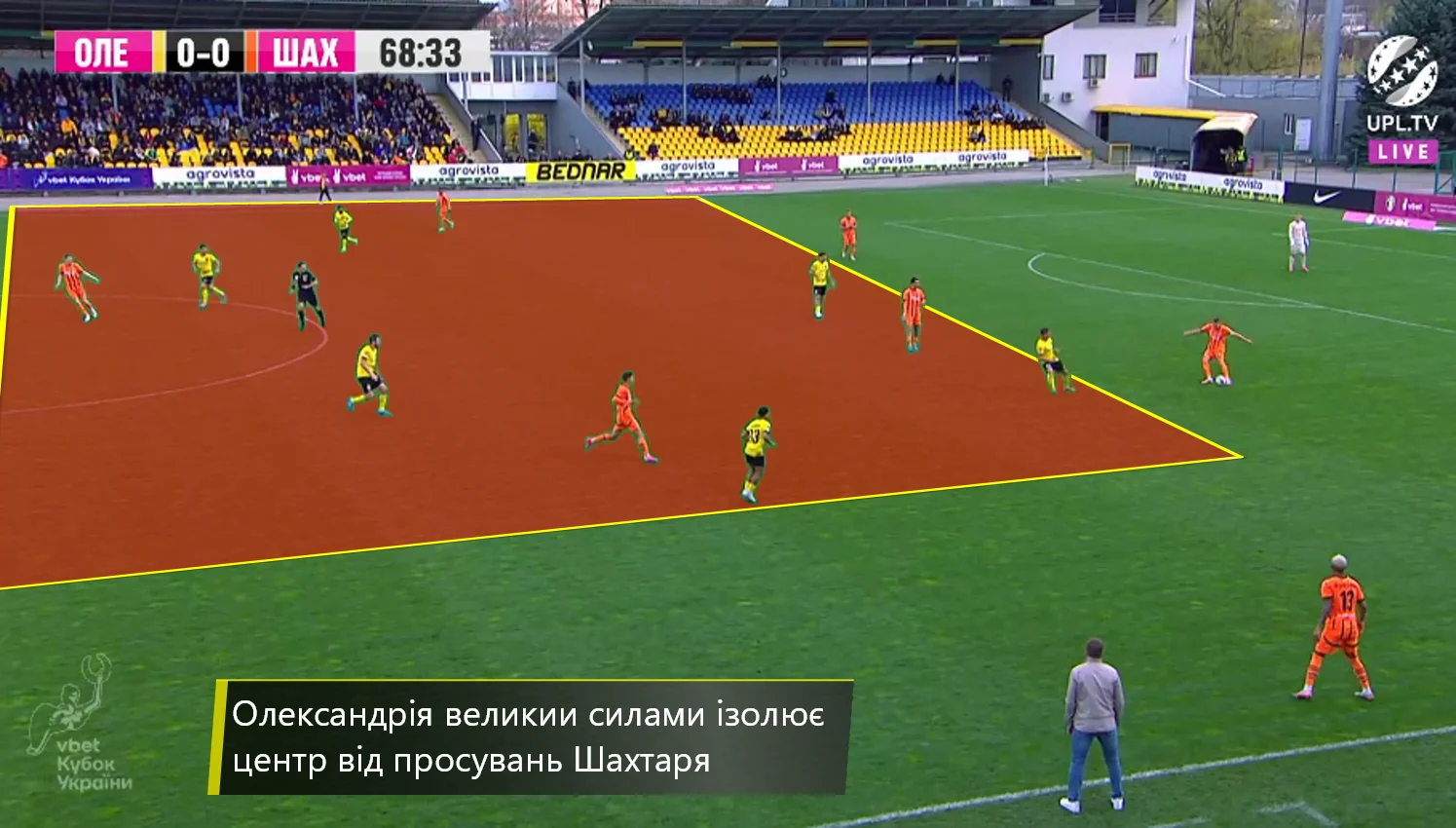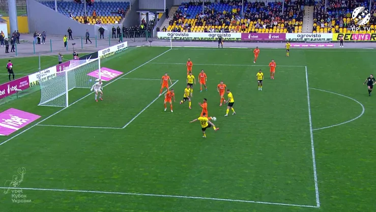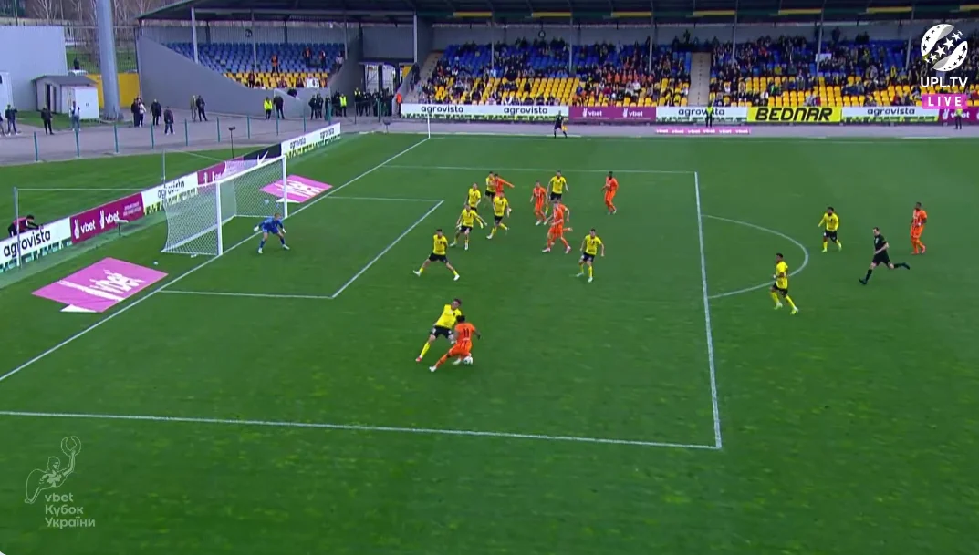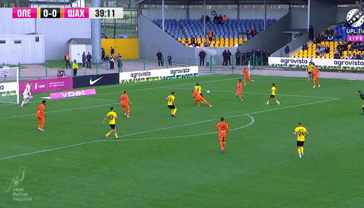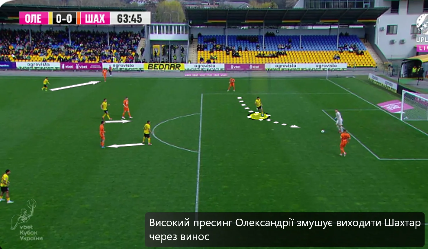 Повторювати цю помилку "містяни" не стали. У першому таймі Олександрія зробила ставку на агресивний футбол. "Жовто-чорні" працювали за класичними шаблонами – з високою інтенсивністю у середньому блоці, з проактивністю (тобто з висмикуванням із лінії й грою на випередження) та з короткими розіграшами у білд-апі (при активній ролі голкіпера).