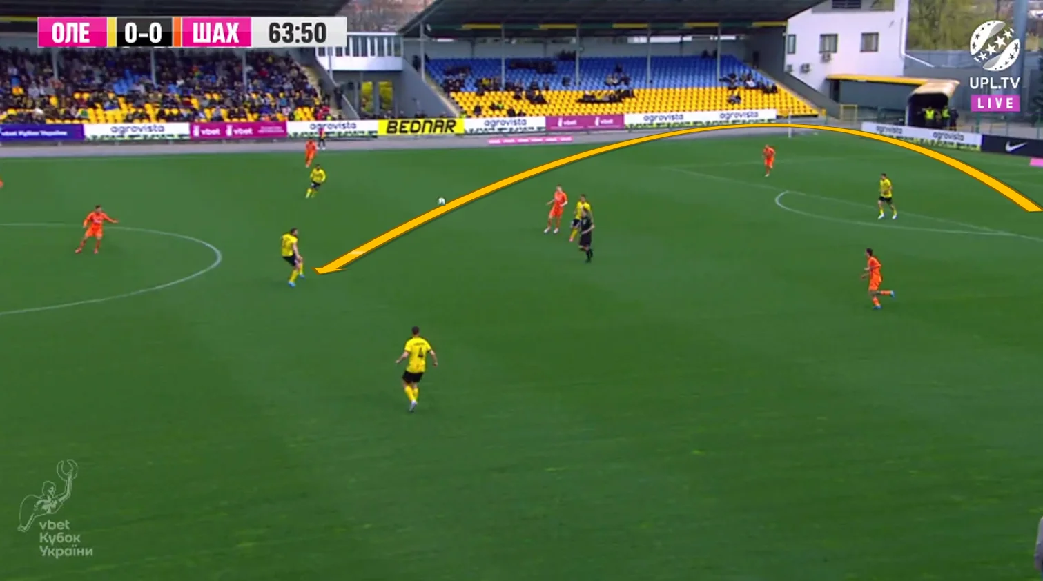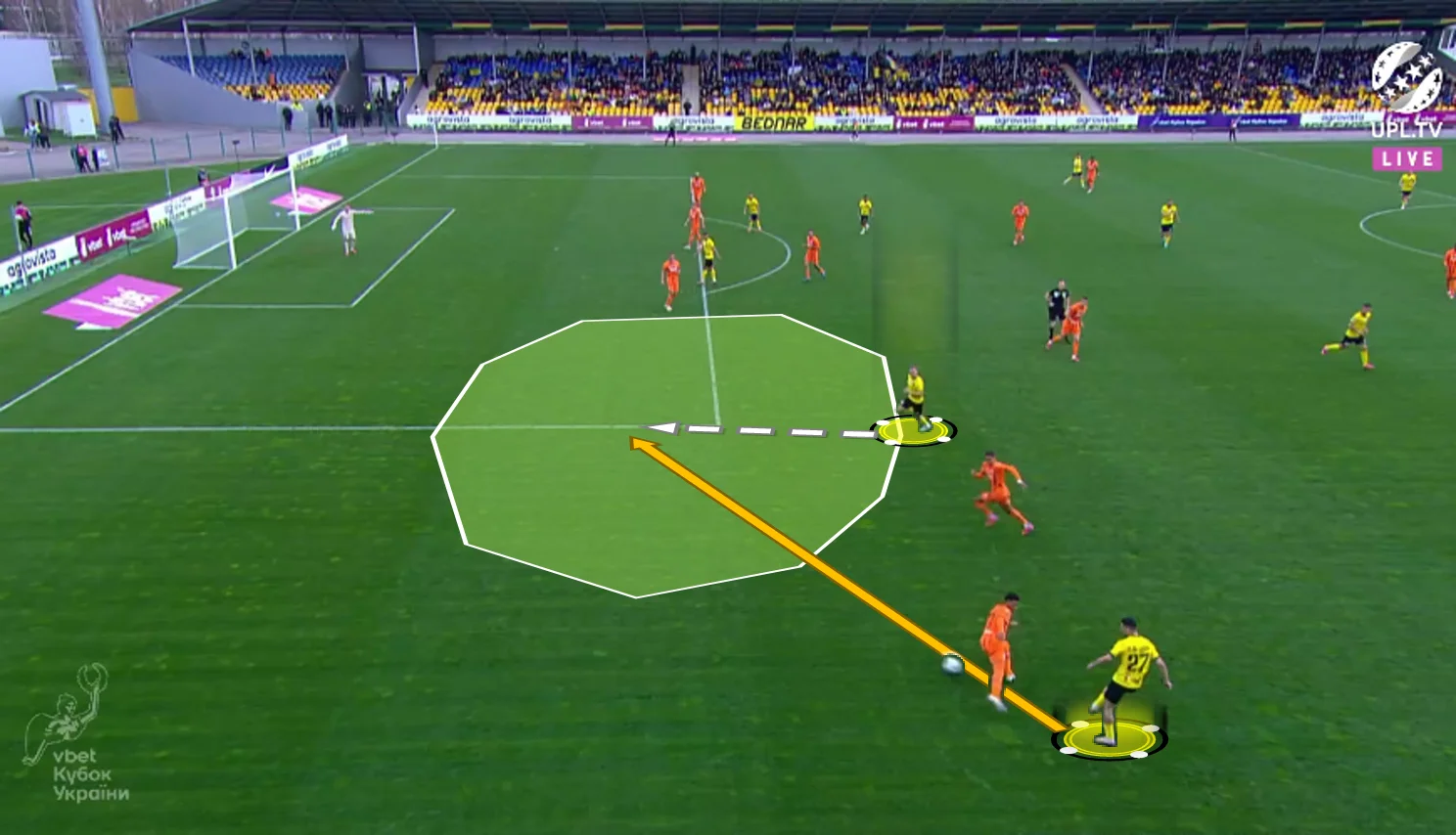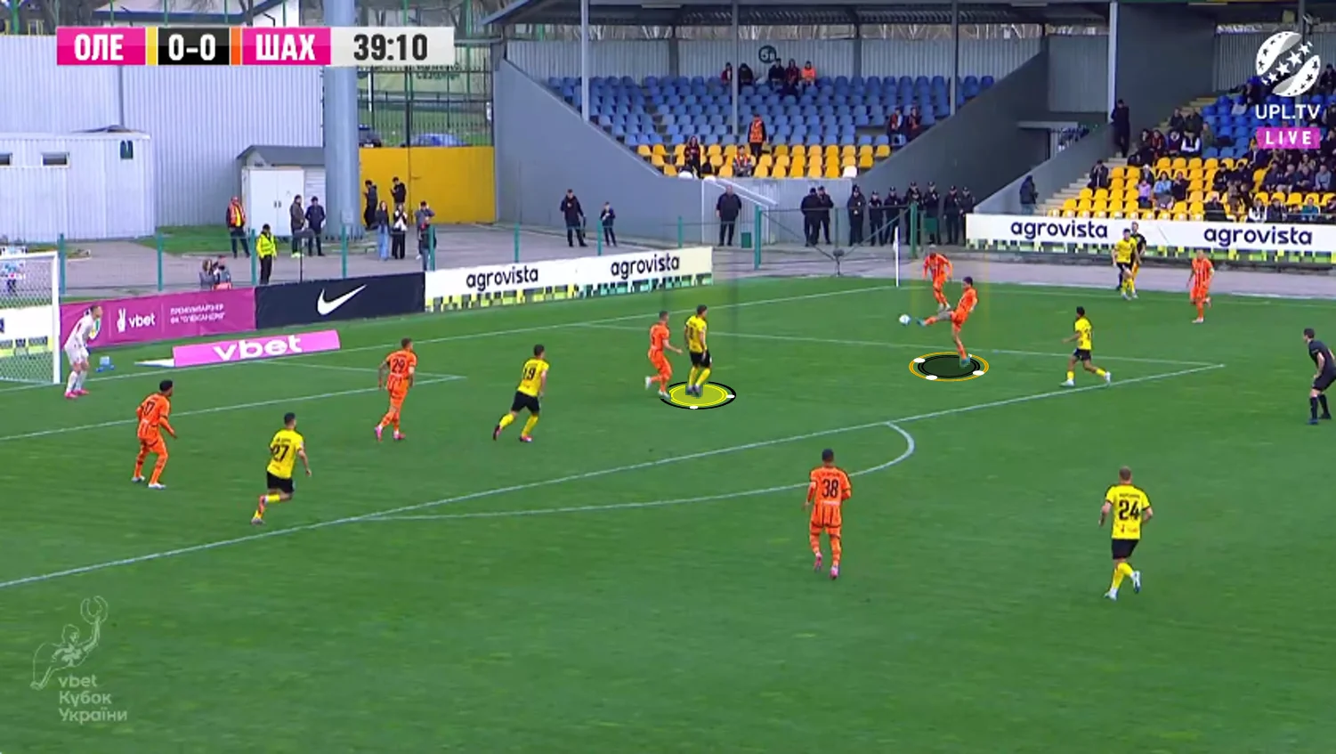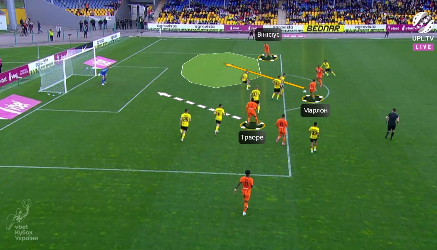 Повторювати цю помилку "містяни" не стали. У першому таймі Олександрія зробила ставку на агресивний футбол. "Жовто-чорні" працювали за класичними шаблонами – з високою інтенсивністю у середньому блоці, з проактивністю (тобто з висмикуванням із лінії й грою на випередження) та з короткими розіграшами у білд-апі (при активній ролі голкіпера).
