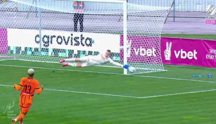 А от Філіппов за хвилину до цього пробивав низом, замикаючи простріл Кравченка на ближню – Марлон припустився технічної помилки в даному епізоді, але потім врятував, накривши удар Олександра.