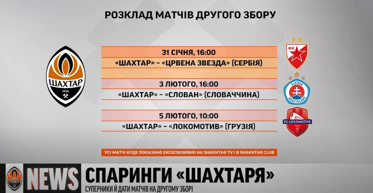 Спаринги "гірників" будуть проходити кожні три дні, повідомляє офіційний сайт Шахтаря. Перший – проти словенської Мури – відбудеться вже 31 січня (старт – о 10:00). Того ж дня команда Каштру зіграє з Црвеною Звездою (16:00 за Києвом). Надалі Шахтар зустрінеться зі Слованом із Братислави та грузинським Локомотивом.
